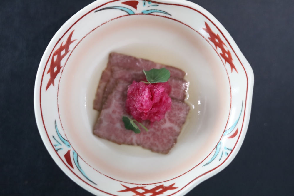 先付:黒毛和牛のローストビーフ 煎り酒