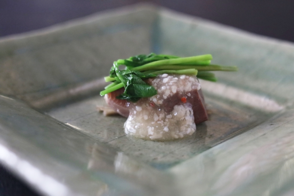 お魚の出汁に浸した大中寺芋、沼津産海ブドウ、蜂蜜とレモンを合わせた卵黄ベースのソースでお召し上がりください