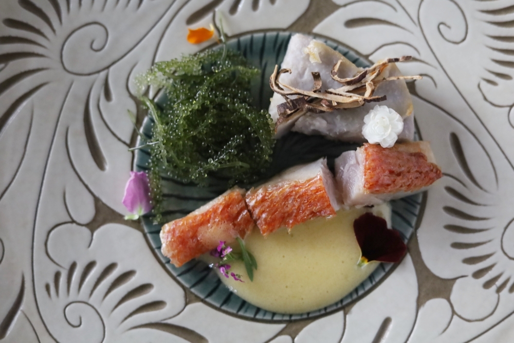 魚介料理:金目鯛の鱗焼き 蜂蜜レモンソース 大中寺芋と沼津産海ブドウを添えて